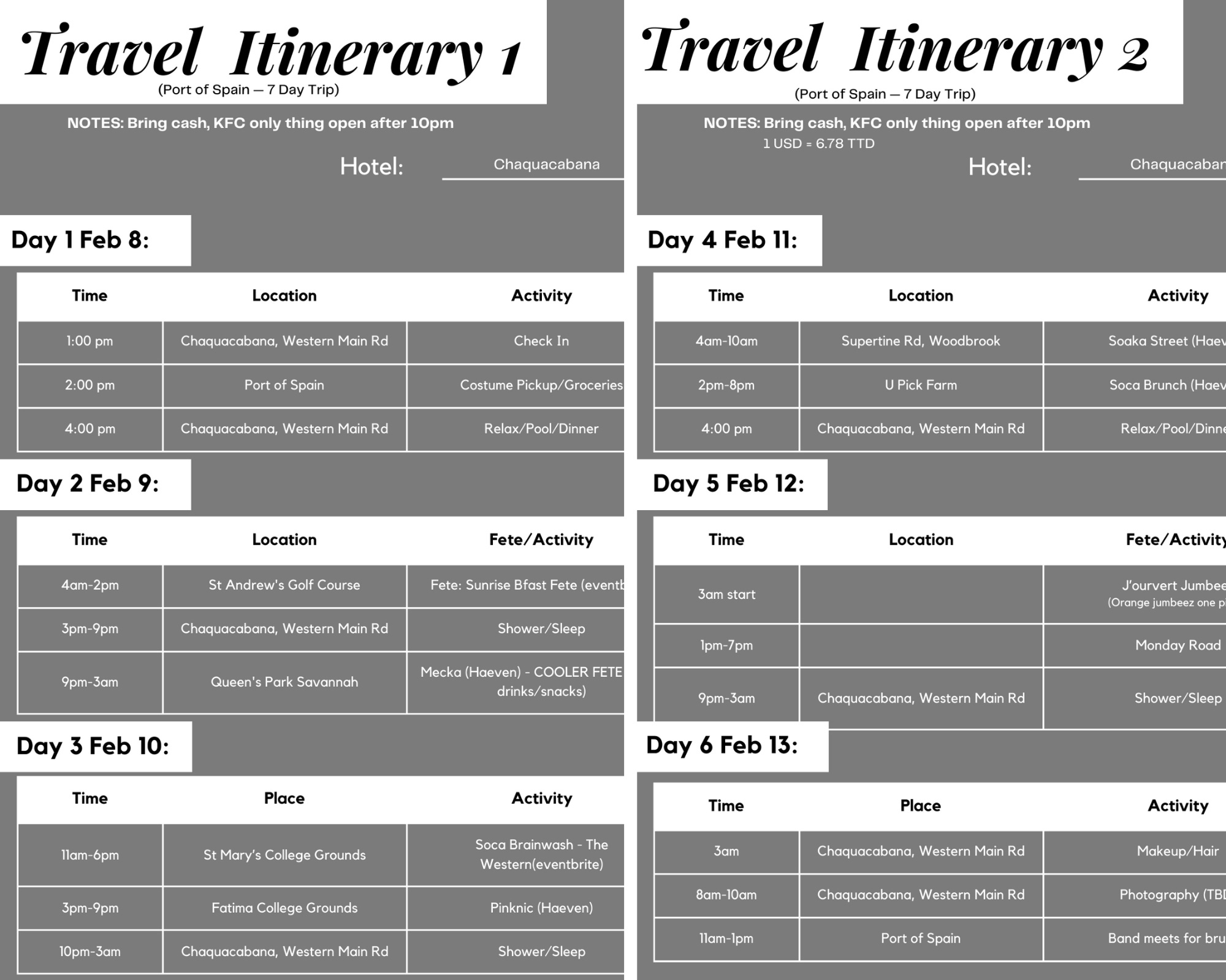 If you are thinking about doing any of the above cost-savings tips aside from booking early then please don’t go to Trinidad carnival. Do yourself and us all a favor and book another trip. You’ll be the one complaining Trinidad carnival is not worth it and it will because you did not experience it authentically. It is an expensive trip but once you commit to the flight, please know the costs will go up from there. I spent about $5,000 when I went to Trinidad carnival in 2022. I will provide my updated cost sheet below so you can mentally prepare for it.